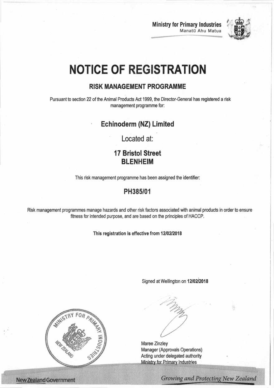 Echinoderm NZ owns Sea Cucumber quota in the pristine waters of Marlborough Sounds, Tasman/Golden Bay area West Coast of the South Island of New Zealand and on the West and East coast of New Zealand’s North Island.